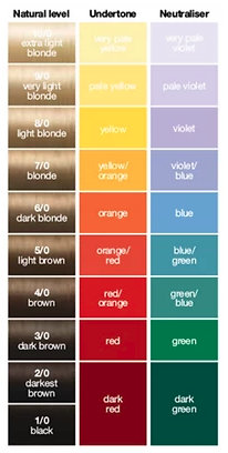 Jede Tonhöhe hat ihre eigenen charakteristischen Pigmente, die nach außen dringen (siehe Bild unten). Beim Aufhellen tritt ein warmer Unterton in den Vordergrund - rote Töne in den dunkleren Farben und goldene Töne in den helleren Farben. Wenn Sie diesen Effekt unterdrücken möchten, müssen Sie die Farbe mit einer entsprechend gewählten Farbe der Haarfarbe oder mit einem neutralisierenden Haarfarbe - Neutralisator abgleichen.
