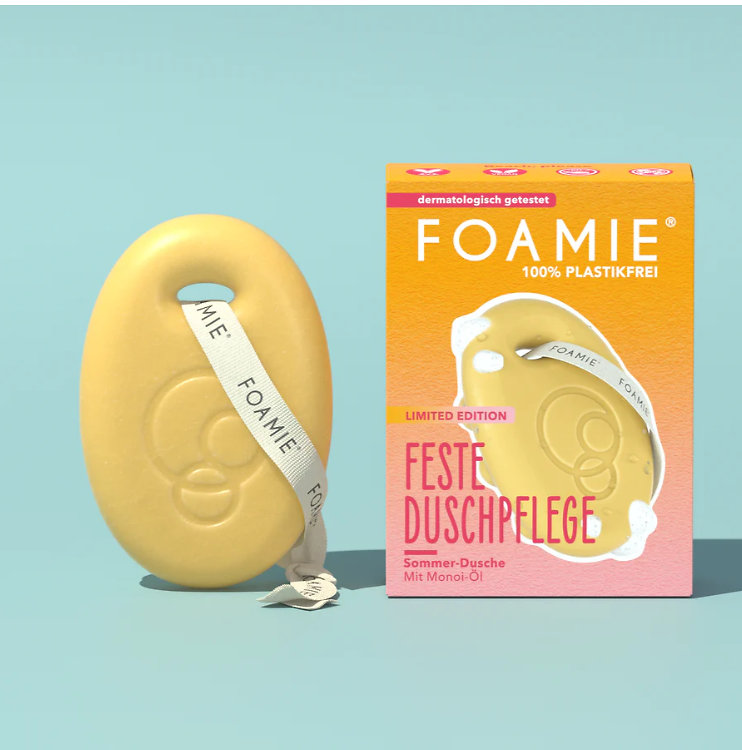 Während des Duschens die Seife unter fließendem Wasser anfeuchten, dann zwischen den Händen reiben, um Schaum zu erzeugen, den Sie sanft in die nasse Haut einmassieren. Nach dem Abspülen die Seife an der Schnur aufhängen, um sie zu trocknen, oder sie im Foamie Travel Buddy Reiseetui aufbewahren.